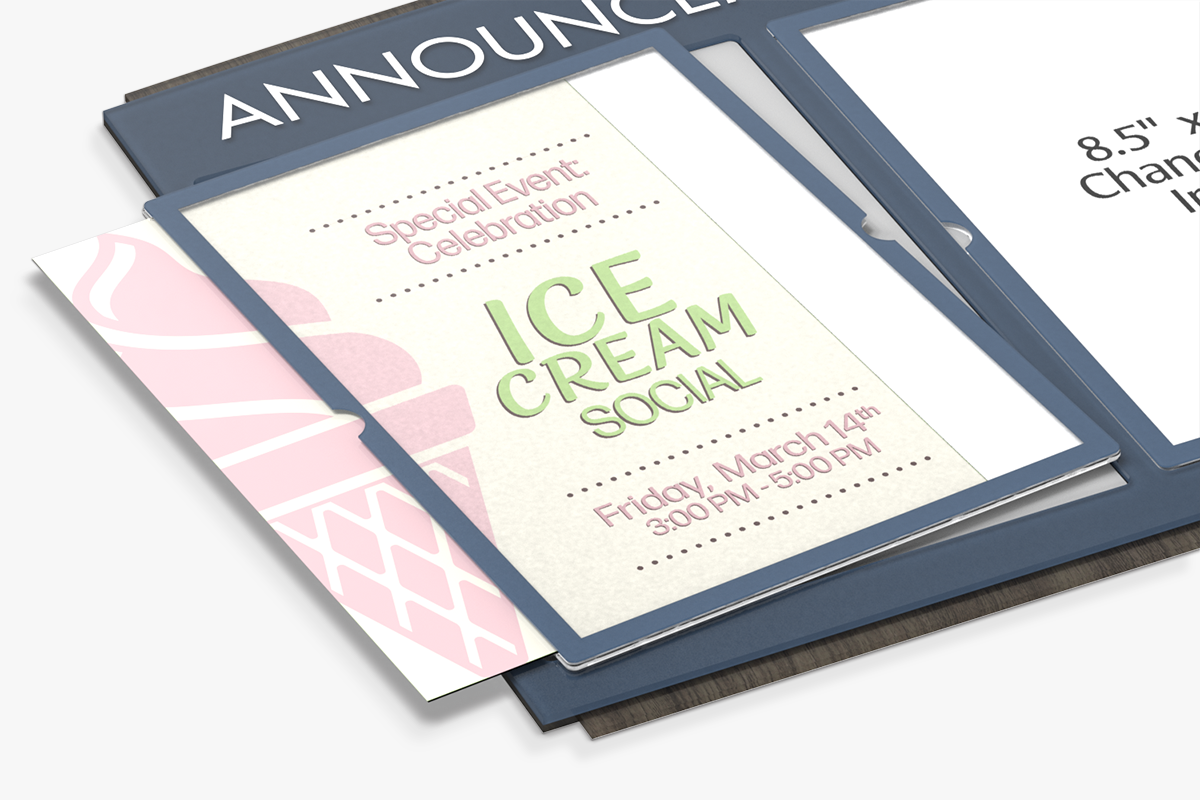 • Three insert holders with protective lens covers accommodate printed 8.5" x 11" pieces of standard paper.