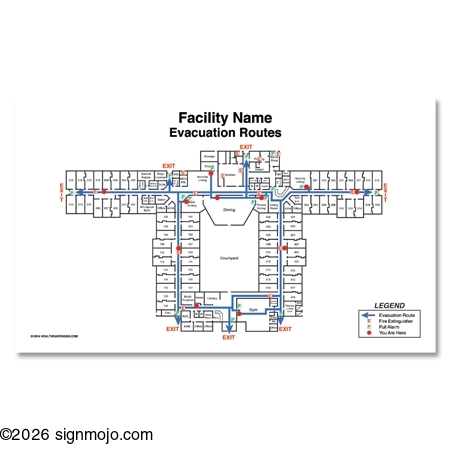 - Identifies "You Are Here" location, fire extinguishers, pull alarms, and escape routes.