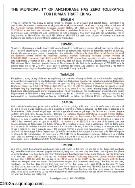 Human Trafficking Notice - Alaska Code (English/Spanish/Tagalog/Samoa/Hmong)